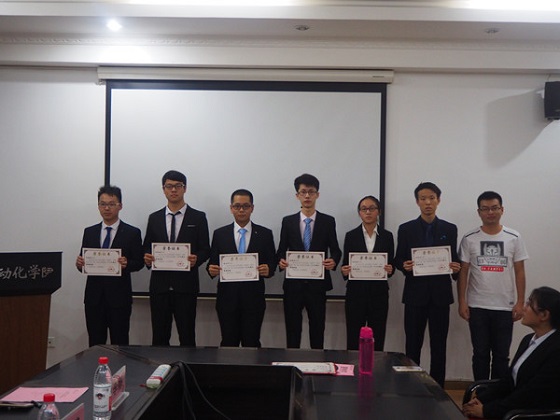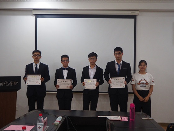 19时整,典礼正式开始,宋广轩同学首先介绍了到场的嘉宾。随后王寅等五位电95奖学金获得者依次上台,从思想建设、学习生活、兴趣爱好、社团活动、理想规划等方面展示自己大学第一学年的风采。展示完毕后,景鹏老师、李娜老师、侯捷老师分别为荣获电95奖学金、人民特等及一等奖学金、人民二等奖学金的同学们颁发证书并合影留念。