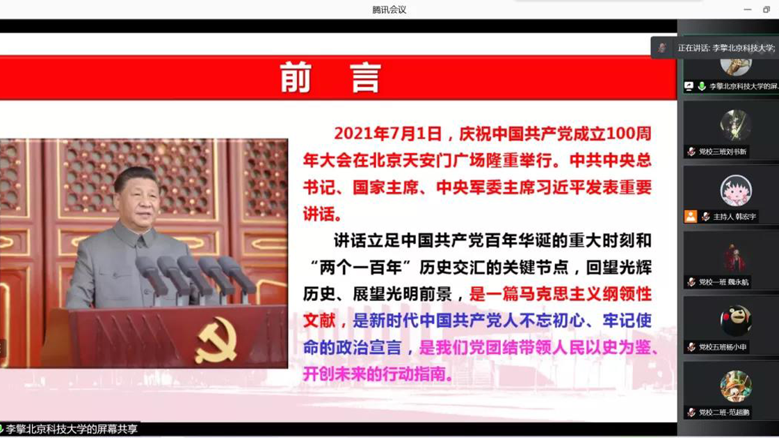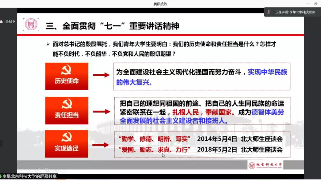 首先,李擎老师阐释了习近平总书记“七一”重要讲话的重大意义。随后,李擎老师结合中国共产党的百年历程以及所取得的伟大成就,讲述了“七一”重要讲话的丰富内涵,并鼓励同学们认真学习、深刻思考。
