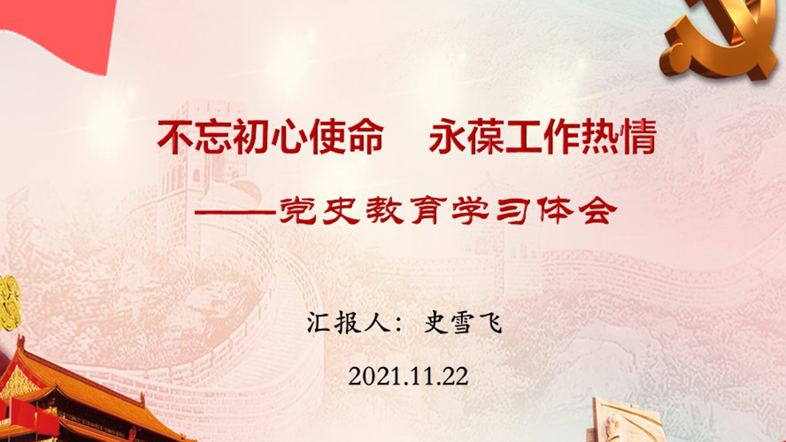 史雪飞老师以“不忘初心使命、永葆工作热情”为题,从社会主义革命和建设时期、改革开放和社会主义现代化建设时期、中国特色社会主义进入新时代三个历史时期的热点事件切入,系统回顾了我们党团结带领中国人民为实现中华民族伟大复兴的辉煌奋斗历程,并从八个方面全面阐述了十八大以来我国发生的历史性变革,深刻剖析了党的百年光辉历程带给我们的历史启示。史老师结合岗位实际,从讲台空间、教学改革、三全育人、教师发展等方面汇报了个人体会。她表示,作为一名工作在一线的教师,要从党史学习教育中汲取智慧和力量,牢记初心使命,永葆工作热情,扎实做好教育教学、本科生全程导师和教师发展中心等工作,为学生的全面成长积极营造个性化、开放式的教学生态环境,为学院青年骨干教师的发展提供更多支持。