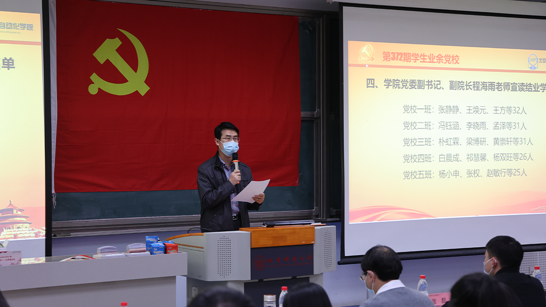 12月3日19时30分,RAYBET在线登录平台第372期学生业余党校暨入党积极分子培训班结业典礼于机电楼201召开,RAYBET在线登录平台党委委员、RAYBET在线登录平台党委书记李擎,RAYBET在线登录平台党委副书记、副院长程海雨,党建辅导员杨美偲,本科2019级辅导员蒋丹阳、王蒙蒙,党校各班班主任以及全体党校成员参加典礼。本次典礼由学院党建辅导员韩宏宇主持。