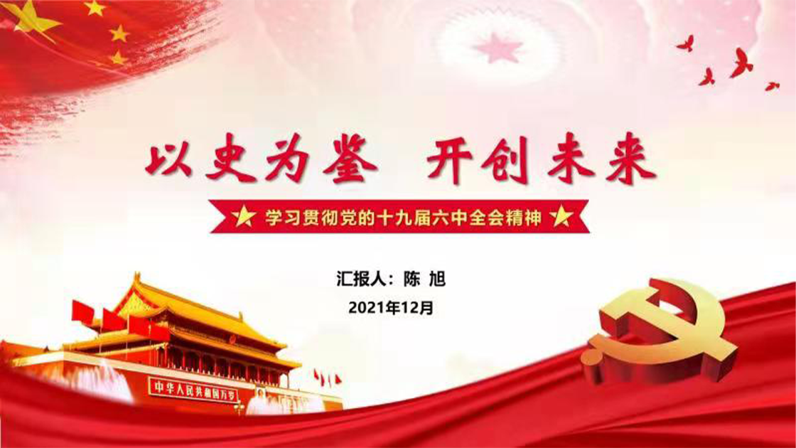陈旭老师以“以史为鉴、开创未来——学习贯彻党的十九届六中全会精神”为题,对党的十九届六中全会情况简介、《中共中央关于党的百年奋斗重大成就和历史经验的决议》(以下简称《决议》)解读、贯彻落实好全会精神三个部分进行了全面、系统、深入解读。陈老师详细整理了十九届中央历次全会以及改革开放以来历届六中全会的主要议题,纵向比较了百年党史中的三个“历史决议”,并通过提炼关键词从九个部分全面深入地解读了《决议》全文。领学最后,陈旭老师结合分管工作,从“认真贯彻决议精神,坚决做到‘两个维护’”“学深悟透决议内容,落实立德树人任务”“矢志践行初心使命,勇于创新善于作为”“坚持理论联系实际,推动学院中心工作”四个方面就如何贯彻落实好全会精神进行了阐述。