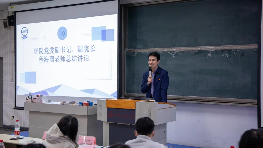 最后,程海雨老师作总结讲话。程老师对一年来团学的工作表示肯定与鼓励,并对未来的工作提出了三个方面的要求:第一,提高政治站位,明确自身职责。团学组织应把握自身定位,各类活动要把好政治关、守好政治阵地,确保正确的政治方向。第二,围绕中心工作,凸显自身作用。团学组织应进一步发挥贴近学生的优势,引领、服务、凝聚青年,将“立德树人”的根本任务落到实处。第三,聚焦能力提升,加强自身建设。团学组织应保持积极的精神面貌,锤炼过硬的作风,加强活动组织开展的规范性,从而实现培养“德智体美劳”全面发展接班人的成效。希望各位同学珍惜在团学组织工作的机会,提升自身能力,发挥模范作用。